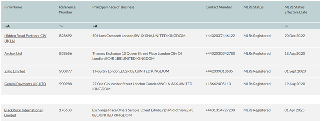 FCAning veb-saytiga ko’ra, BlackRock 2025-yil 1-aprelda rasmiy ravishda kripto aktiv firmasi sifatida ro’yxatdan o’tgan 51-kompaniya bo’ldi. Firma FCAning qat’iy tartibga solish talablariga javob bergan Coinbase, PayPal va Revolut kabi moliyaviy subyektlar guruhiga qo’shildi.