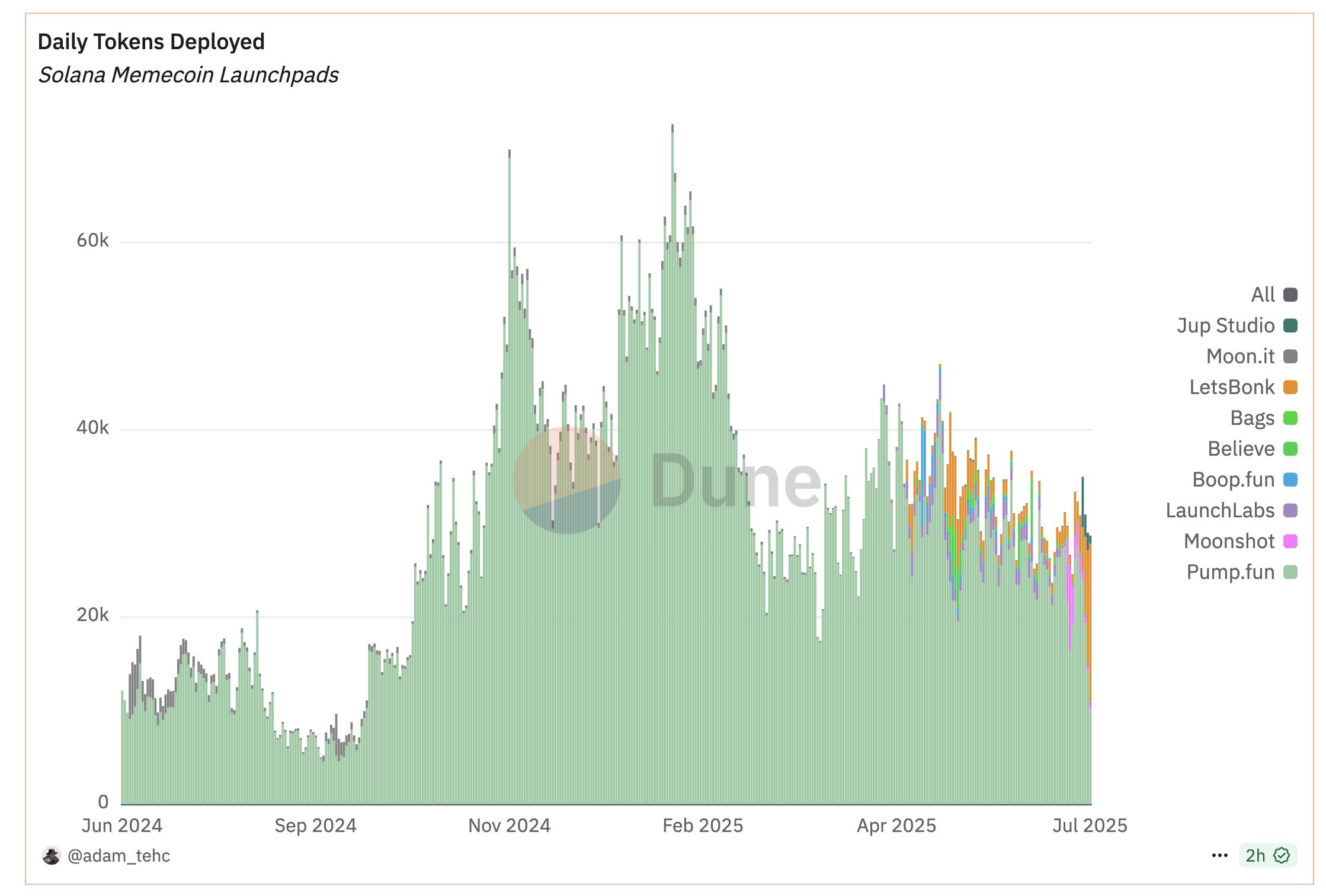 Oxirida, Bonkning markazlashmagan memkoin ishga tushirish platformasi, LetsBonk, sezilarli o’sishni ko’rsatdi va Pump.fun, yetakchi token ishga tushirish platformasidan oshib ketdi. Dune ma’lumotlariga ko’ra, bugun LetsBonkda 16,797 memkoin ishga tushirildi, Pump.funning 10,111 tokenidan oshib ketdi.