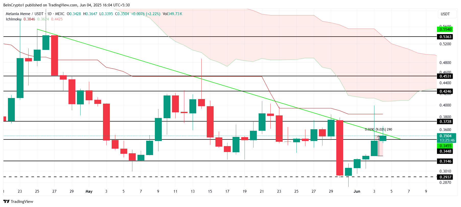 MELANIA bir yarim oylik pasayish tendensiyasidan aziyat chekmoqda, ammo so’nggi 24 soat ichida 9% o’sishni ko’rsatdi. $0.35 da savdo qilayotgan altkoin, pasayish tendensiyasini yengishga harakat qilmoqda. Biroq, umumiy bozor hissiyoti va qarshilik bu o’sishni davom ettirishni qiyinlashtirishi mumkin.