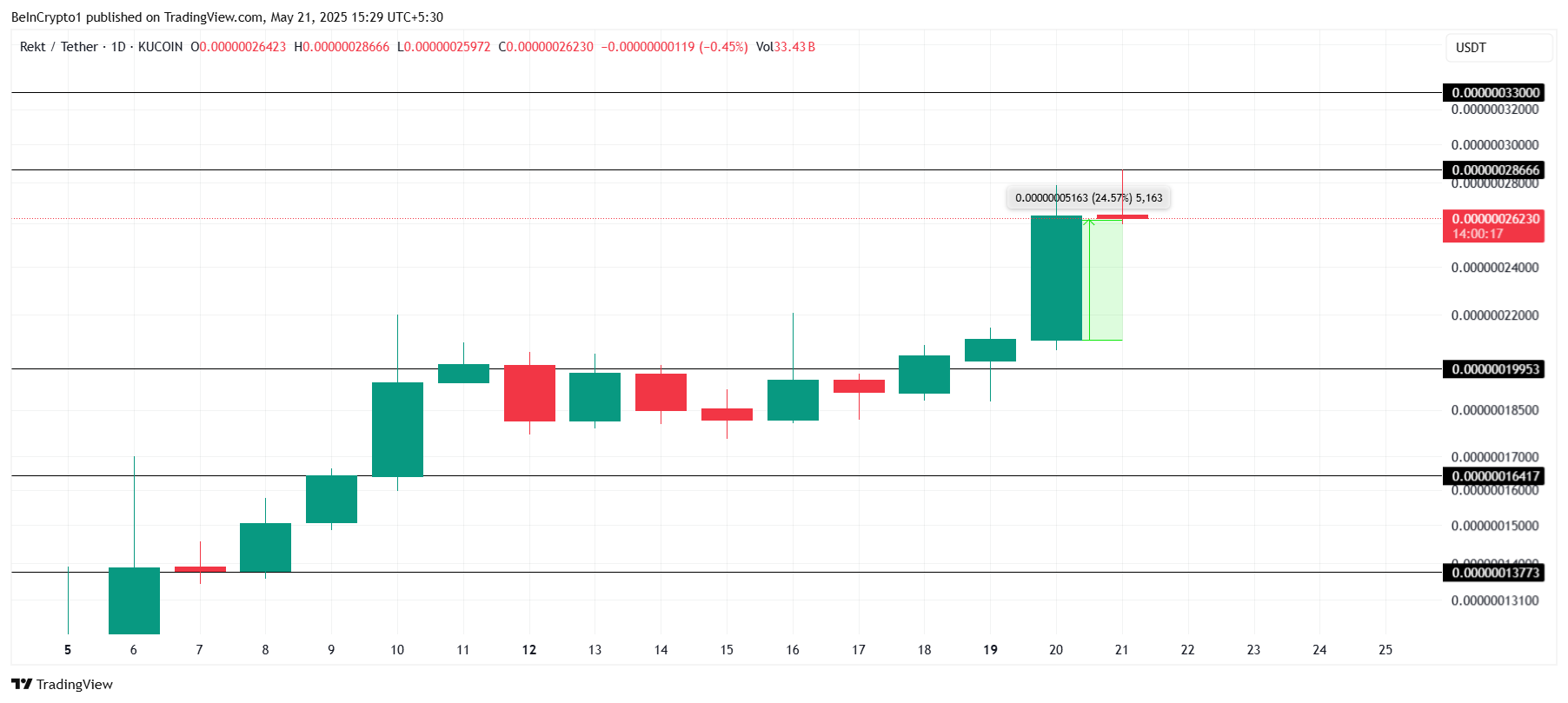 Investorlarning kuchli qo’llab-quvvatlashi «REKT»ning yuqoriga harakatlanishi uchun juda muhim. Hozirda $0.000000286 darajasida qarshilikka duch kelmoqda. Agar bu darajadan o’tib ketsa, meme tanga $0.000000330 tomon harakatlanishi mumkin. Ushbu qarshilikdan muvaffaqiyatli o’tish investorlarning ishonchini oshiradi va davom etayotgan buqa bozorini kuchaytiradi.