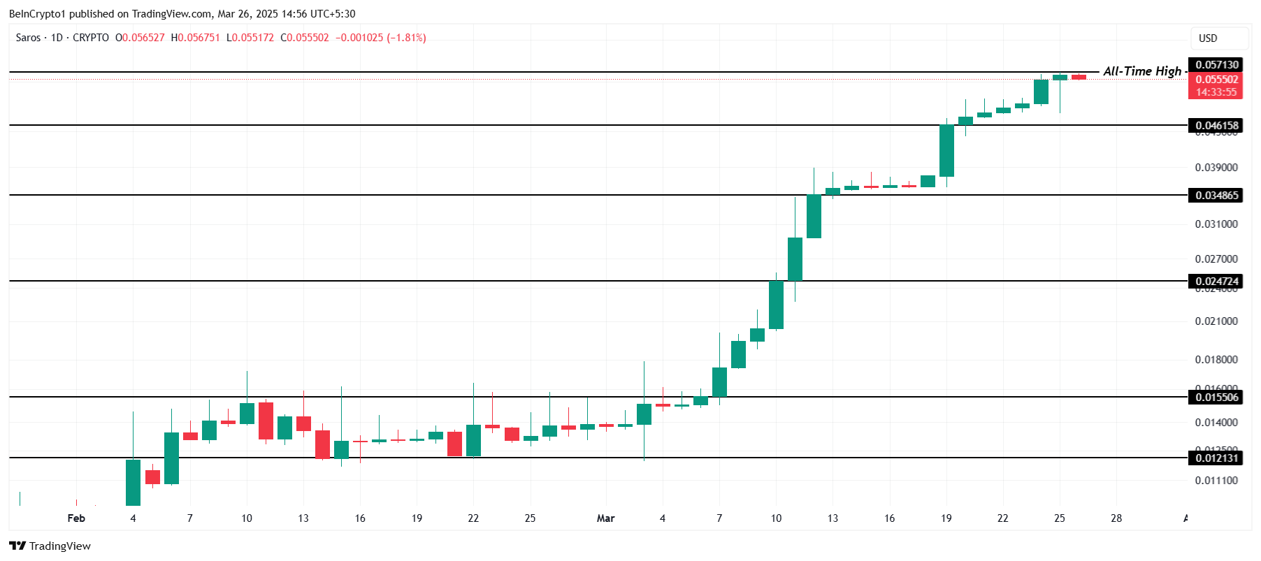 Agar kengroq bozor signallari kuchli bo’lib qolsa, SAROS o’sish tendensiyasini saqlab qolishi mumkin. Narx $0.060 qarshilik darajasidan o’tib, o’z yutuqlarini kengaytirishi mumkin. Bu davom etayotgan optimistik kayfiyatni ko’rsatadi va ko’proq investorlarni jalb qilishi mumkin, altkoinni yangi cho’qqilarga olib chiqadi.