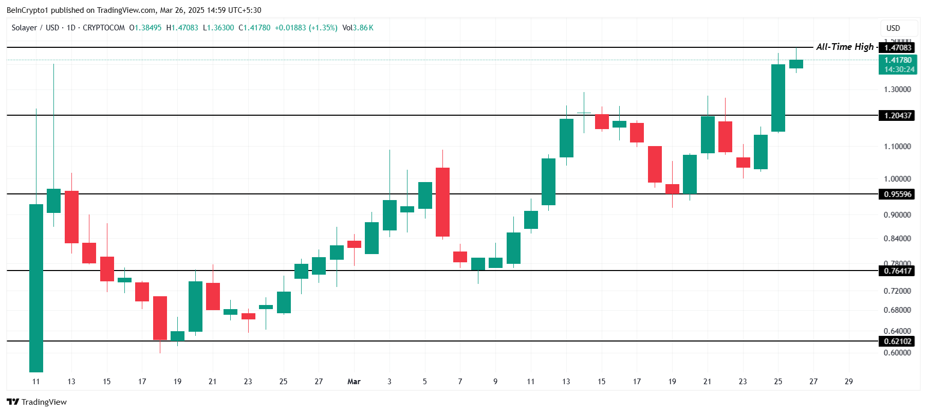 LAYER so’nggi 24 soat ichida 23% ga oshdi va yozish vaqtida $1.41 ga yetdi. Altkoin kun ichidagi cho’qqilarda $1.47 yangi tarixiy cho’qqiga (ATH) erishdi. Bu o’sish qisqa muddatda kriptovalyutaga bo’lgan kuchli bozor qiziqishi va ijobiy impulsni ko’rsatadi.
