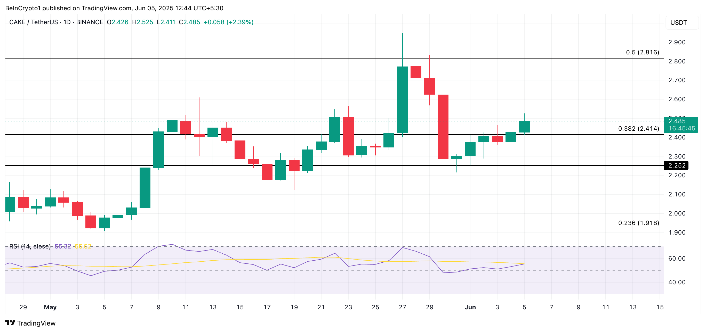 CAKE ning o’sib borayotgan Nisbiy Kuch Indeksi (RSI) bu ijobiy ko’rinishni qo’llab-quvvatlaydi. Hozirda ko’rsatkich 54.75 da va o’sish tendentsiyasida.