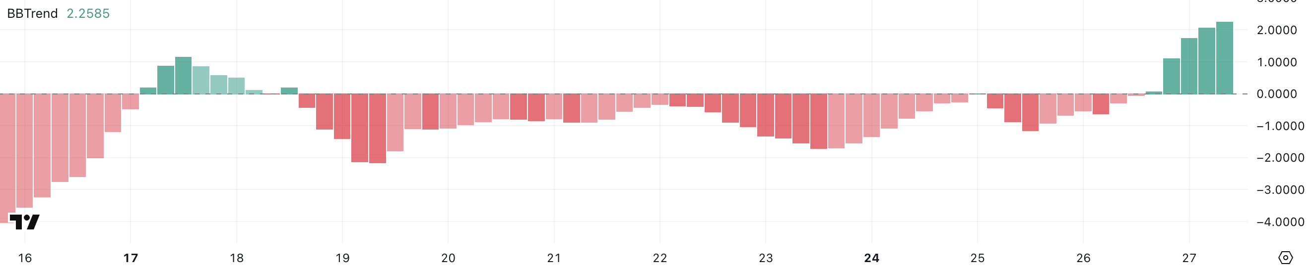 Nol dan yuqori qiymatlar odatda ijobiy sharoitlarni ko’rsatadi, nol dan past qiymatlar esa salbiy kayfiyatni bildiradi. 2.25 ko’rsatkichi narxning o’sib borayotgan volatillik kengayishi bilan yuqoriga qarab harakatlanayotganini ko’rsatadi—hali kuchli trend darajasida emas, lekin sezilarli yaxshilanishni bildiradi.