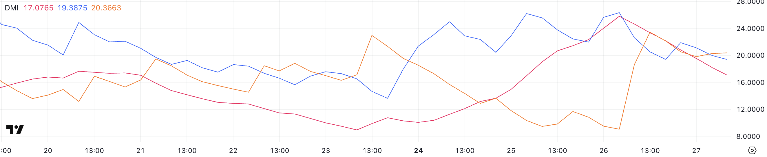 Cardano’ning DMI diagrammasi o’rtacha yo’nalish indeksi (ADX) 17 ga tushganini ko’rsatadi, bu bir kun oldin 25.79 dan keskin pasayishdir. Bu kechagi tez narx o’sishi va keyingi tushishdan keyin trend kuchining sezilarli darajada zaiflashishini ko’rsatadi.