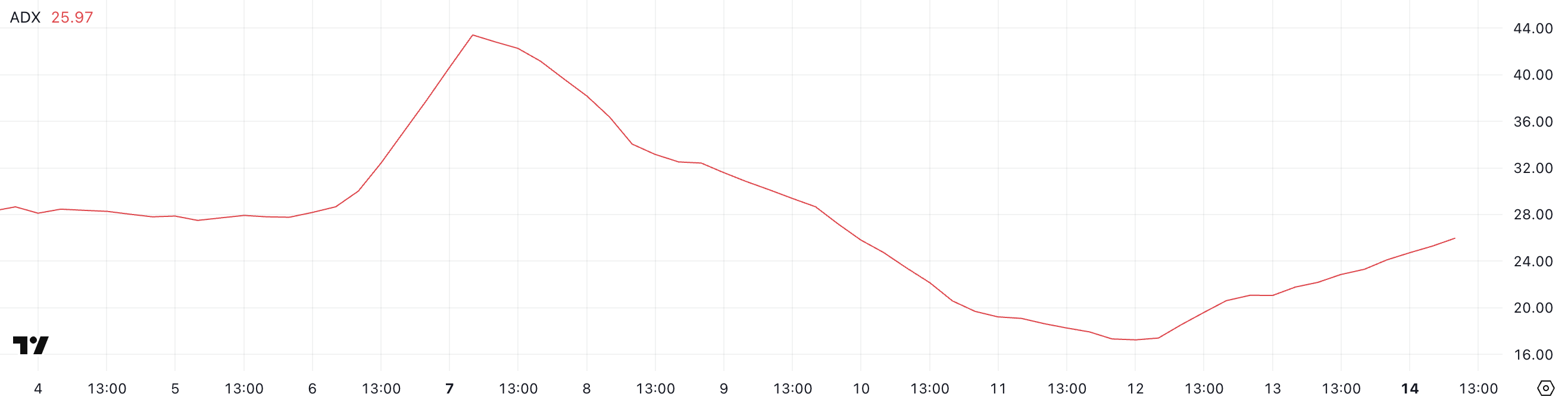 20 dan past o’qishlar zaif yoki mavjud bo’lmagan trendni ko’rsatadi, 25 dan yuqori qiymatlar esa kuchaygan trendni bildiradi. ADAning ADX 25.97 ga yetgani bilan, ko’rsatkich noaniq narx harakatidan ko’proq tuzilgan yo’nalishli harakatga o’tishni ko’rsatadi.