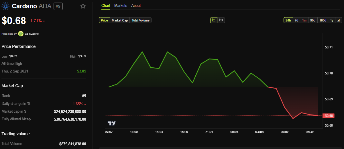 Ushbu maqola yozilayotgan paytda, «Cardano»ning ADA tokeni $0.68 ga savdo qilinmoqda, so’nggi 24 soat ichida deyarli 2% ga pasaygan.
