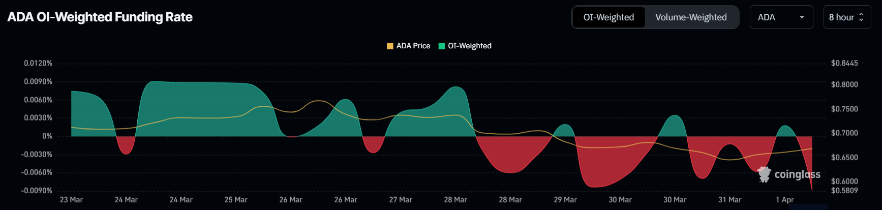 O’tgan hafta davomida Cardano’ning moliyalashtirish darajasi ijobiy va salbiy qiymatlar o’rtasida o’zgarib turdi, bu bozordagi beqaror kayfiyatni aks ettiradi. Ushbu o’zgarish savdogarlar narxning pasayishidan foyda olish uchun qisqa shartnomalar tuzishga harakat qilayotganini ko’rsatadi. Ushbu maqola yozilayotgan paytda, qisqa shartnomalar uzun pozitsiyalarni ustunlik qilmoqda, bu esa savdogarlar ehtiyotkor bo’lib, yanada pasayishni kutayotganini bildiradi.