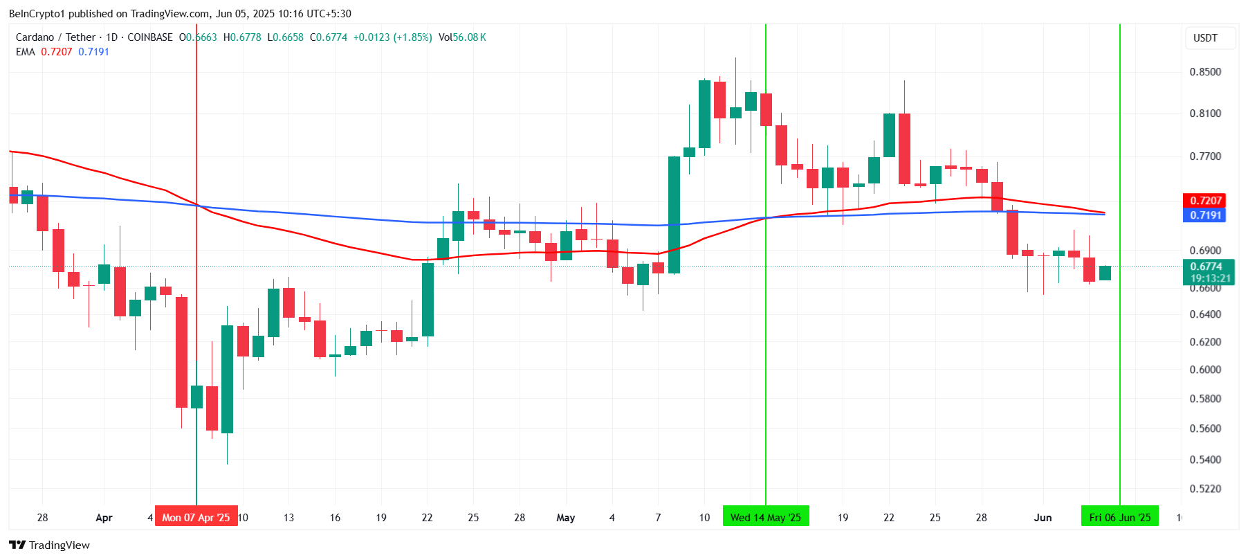 Hozirgi “Cardano” bozor hissiyoti O’lim Kesishi shakllanishi ehtimolini ko’rsatmoqda. Bu 50 kunlik eksponensial harakatlanuvchi o’rtacha (EMA) 200 kunlik EMA dan pastga tushganda sodir bo’ladi.
