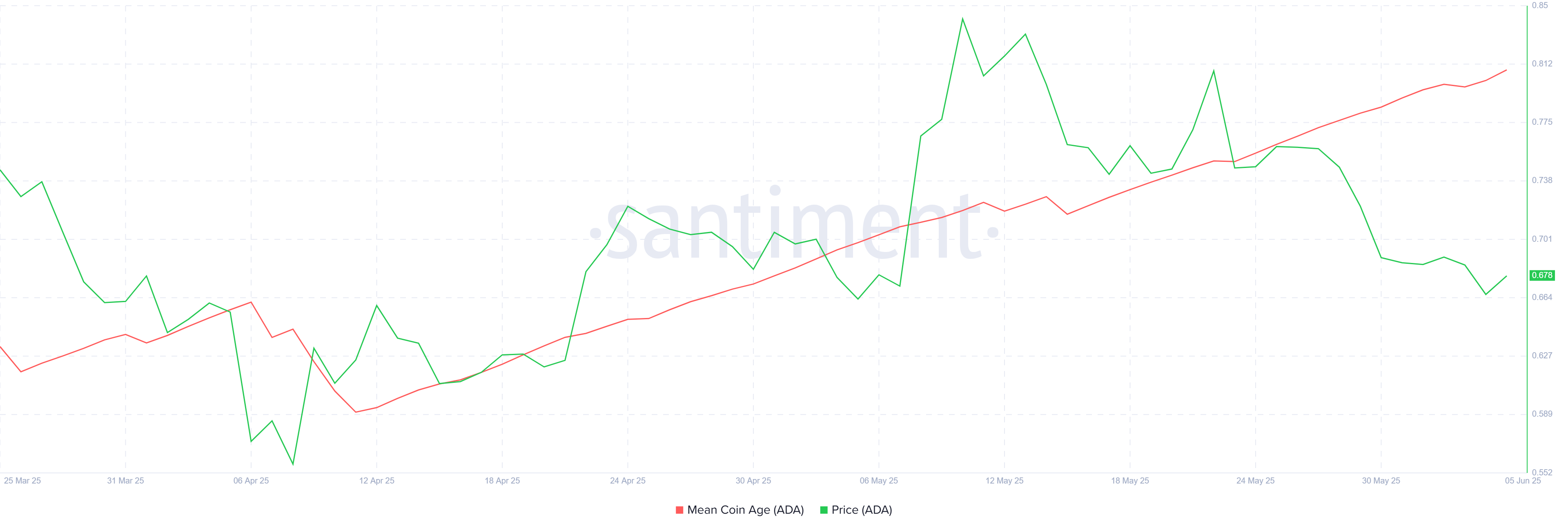 Makro darajada, O’rtacha Tanga Yoshi (OTY) o’sish belgilari ko’rsatmoqda, bu uzoq muddatli egalarning (UME) sotmasdan o’z pozitsiyalarini saqlab qolayotganini bildiradi. Bu xatti-harakat “Cardano” narxini barqarorlashtirish uchun muhimdir, chunki UMElar qisqa muddatli o’zgarishlarga qarshi sotishni odatda rad etadilar. Ularning ADAni ushlab turishga bo’lgan sadoqati qo’llab-quvvatlash darajalarini mustahkamlaydi, bu esa kengroq bozorning pasayish tendensiyalarining ta’sirini yumshatishi mumkin.