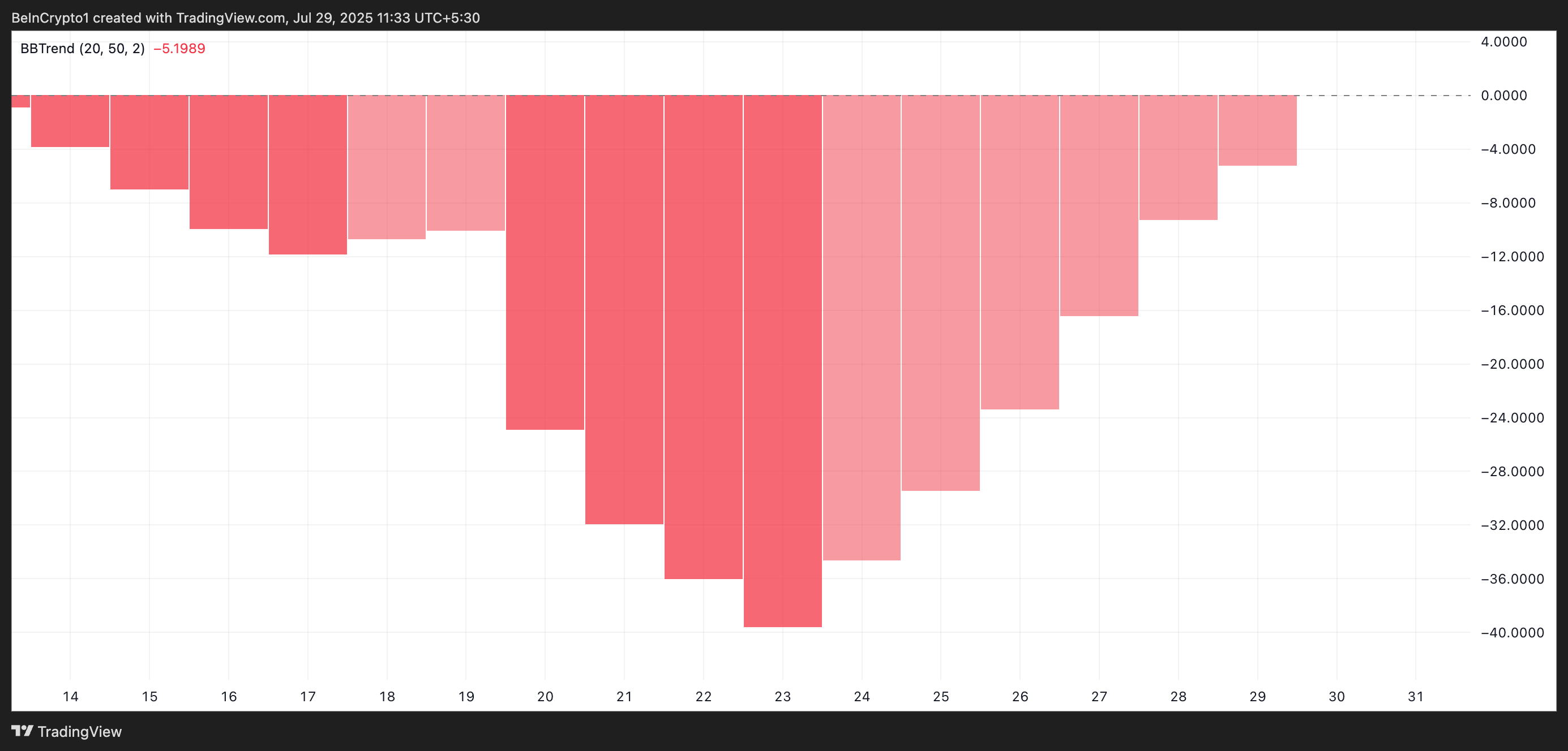 Indikator narx harakatini Bollinger Bands (indikator) ga nisbatan tahlil qilib, tendensiyaning kuchi va yo’nalishini o’lchaydi. Qizil chiziqlar qisqarganda, bozordagi ayirbosh tendensiyasi zaiflashmoqda.