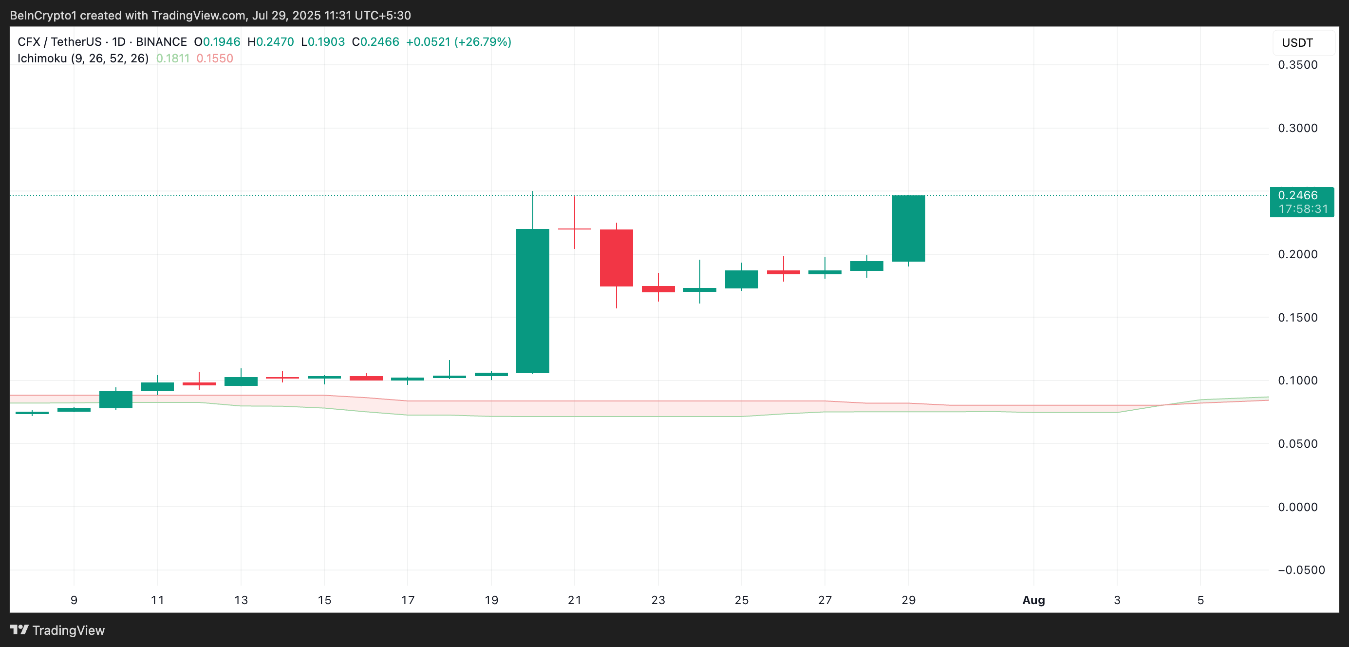 Kundalik grafikda CFX «Ichimoku Cloud» (indikator) ning A va B yetakchi chiziqlaridan ancha yuqorida savdo qilmoqda. Bu token egalari orasida ijobiy hissiyotlarni aks ettiradi. Ushbu chiziqlar hozirda CFX narxidan pastda, mos ravishda $0.1811 va $0.1550 da dinamik qo’llab-quvvatlash darajalarini hosil qilmoqda.