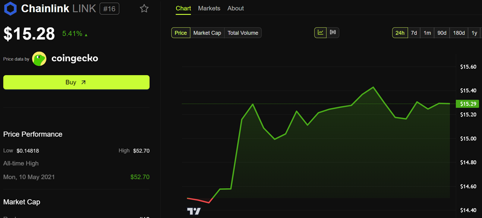 Bu o’sish «Chainlink»ning infratuzilmasiga investorlar ishonchining ortib borayotganini aks ettiradi. Hozirgi vaqtda «Chainlink» narxi so’nggi 24 soat ichida 5% dan ortiq o’sib, $15.28 ga yetdi.