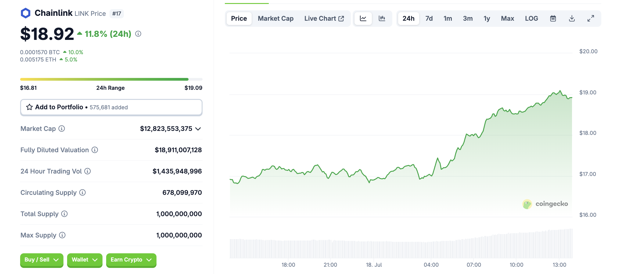 So’nggi 24 soat ichida “Chainlink” loyihasining mahalliy tokeni LINK narxi qariyb 12% ga oshdi va bu kripto hamjamiyatining katta e’tiborini tortdi.