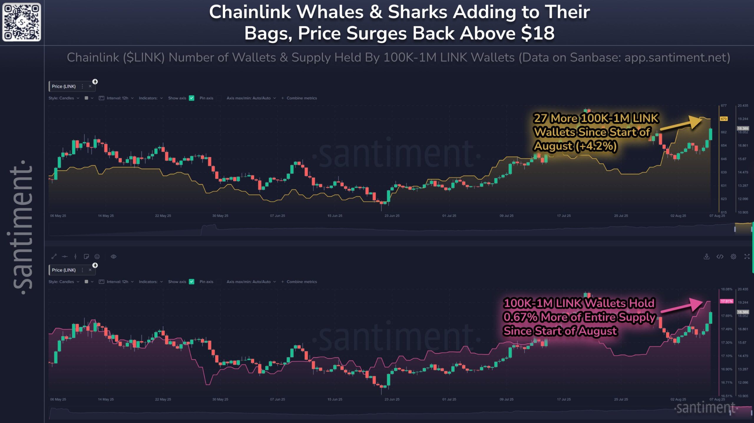 «Santiment» ma’lumotlariga ko’ra, avgust oyida 100,000 dan 1 milliongacha LINK saqlovchi hamyonlar soni 4.2% ga oshdi. Shuningdek, LINKning umumiy ta’minotining 0.67% faqat bir necha kun ichida to’plandi.