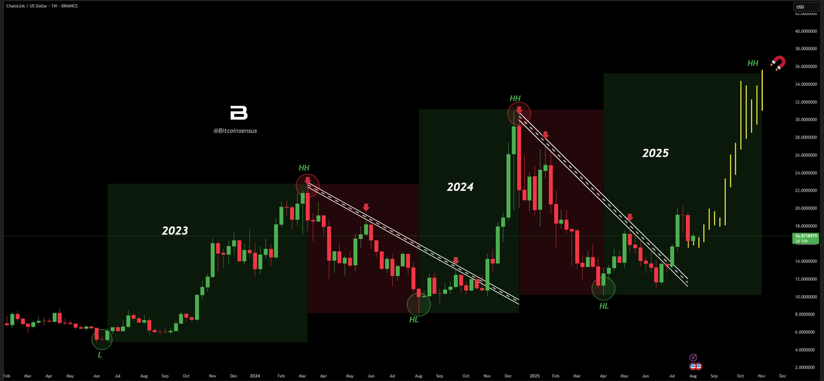 Ba’zi texnik tahlilchilar LINK 2023 va 2024 yillardagi o’sish sikllari davomida ko’rilgan naqshni takrorlayotganini ta’kidladilar. Xususan, «Yuqori Past» (har bir pasayish oldingisidan yuqori) shakllanishi va narxning yorilishi katta yuqoriga harakatlarning odatiy oldingi belgisi hisoblanadi.