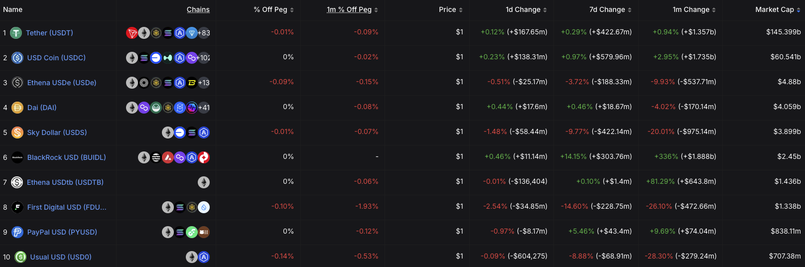 DefiLlama ma’lumotlariga ko’ra, Tether’dan USDT hozirgi kunda 61% bozor ulushi bilan stablecoin bozorida hukmronlik qilmoqda. USDC ikkinchi o’rinni egallagan bo’lsa-da, uning bozor kapitallashuvi USDTning yarmidan kamroq.