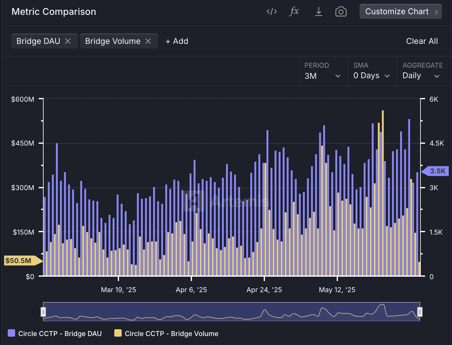 «Circle» kompaniyasining Cross-Chain Transfer Protocol (CCTP) may oyida 7,7 milliard dollarlik stabil tanga ko’prik hajmini amalga oshirdi. Bu tarixiy maksimum bo’lib, aprel oyiga nisbatan 83,3% o’sishni ko’rsatdi.
