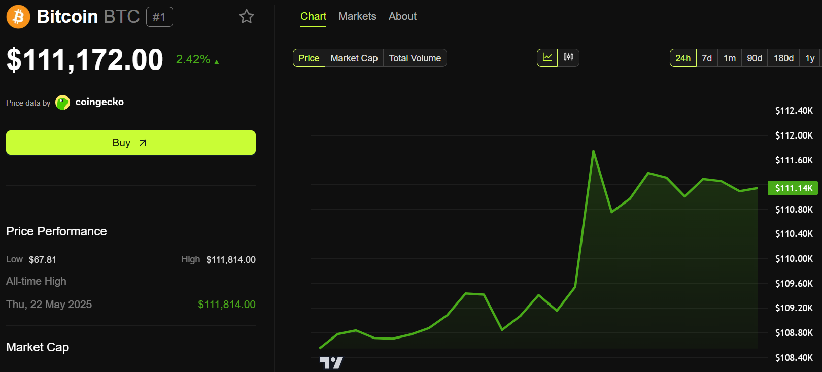 Hozirgi vaqtda, ushbu kripto $111,172 ga savdo qilinmoqda, so’nggi 24 soat ichida deyarli 2.5% ga oshdi. U «Binance» birjasida yangi tarixiy maksimum (ATH) ga erishdi va $111,999 ga yetdi.