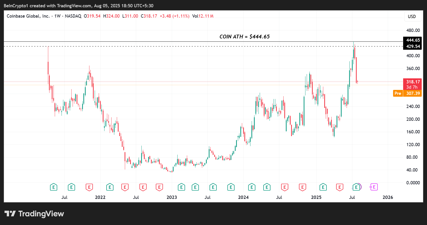 | «Coinbase Global» (COIN) | $318.17 | $307.91 (-3.29%) |