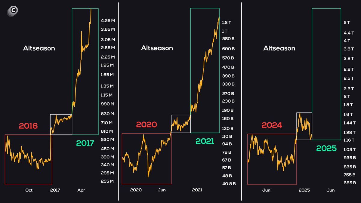 Coinvo 2017 va 2021 yillardagi altcoin bozor kapitalizatsiyasi kengayishlari 2025 yilda takrorlanishi mumkinligini kuzatmoqda. Coinvo’ning diagrammasiga ko’ra, altcoin bozor kapitalizatsiyasi 2025 yilda 5 trillion dollarga ko’tarilishi mumkin — bu hozirgi darajasidan uch barobar ko’p.
