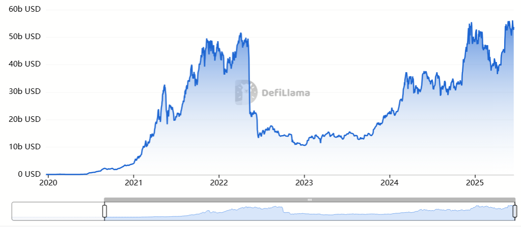 “DefiLlama” ma’lumotlariga ko’ra, iyun oyida kreditlash protokollarida umumiy qulflangan qiymat (TVL) 55 milliard dollardan oshdi, bu DeFi tarixidagi eng yuqori darajadir.