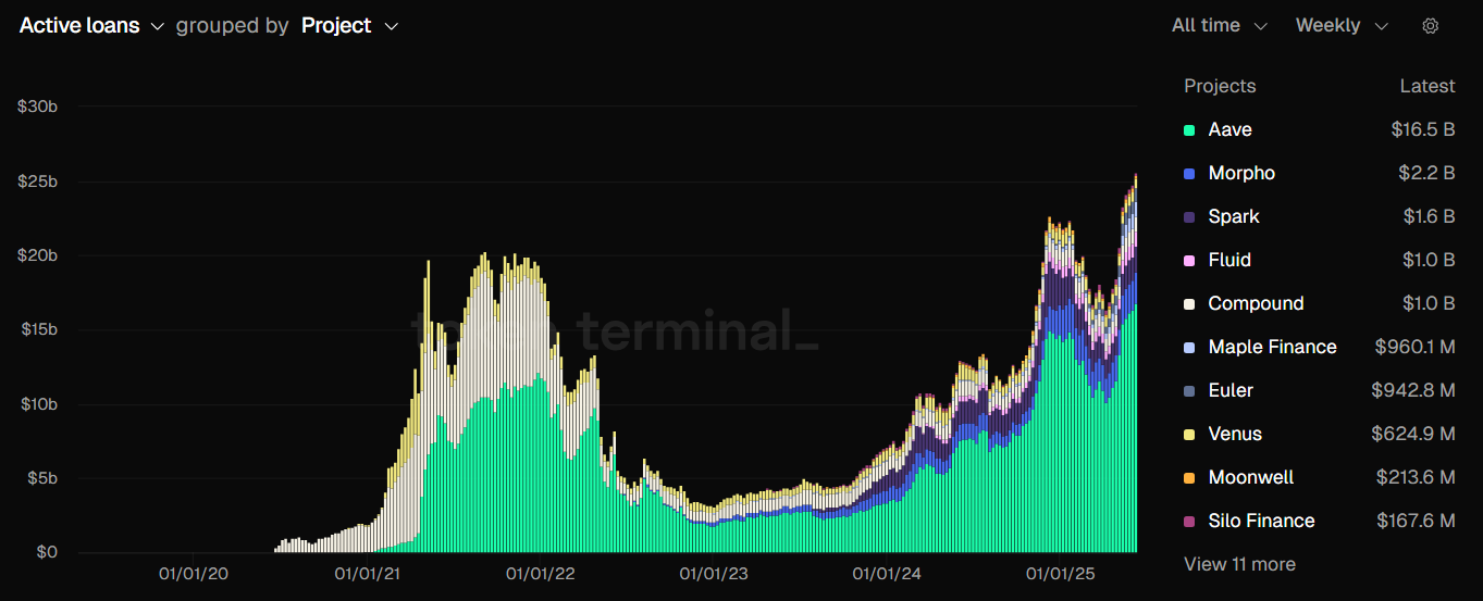Faol kreditlarning taqsimoti shuni ko’rsatadiki, “Aave” 16,5 milliard dollar bilan bozorni egallab turibdi, bu umumiy miqdorning 60% dan ko’prog’ini tashkil etadi. “Morpho” 2,2 milliard dollar bilan ikkinchi o’rinda, “Spark” esa 1,6 milliard dollar bilan uchinchi o’rinda turadi.