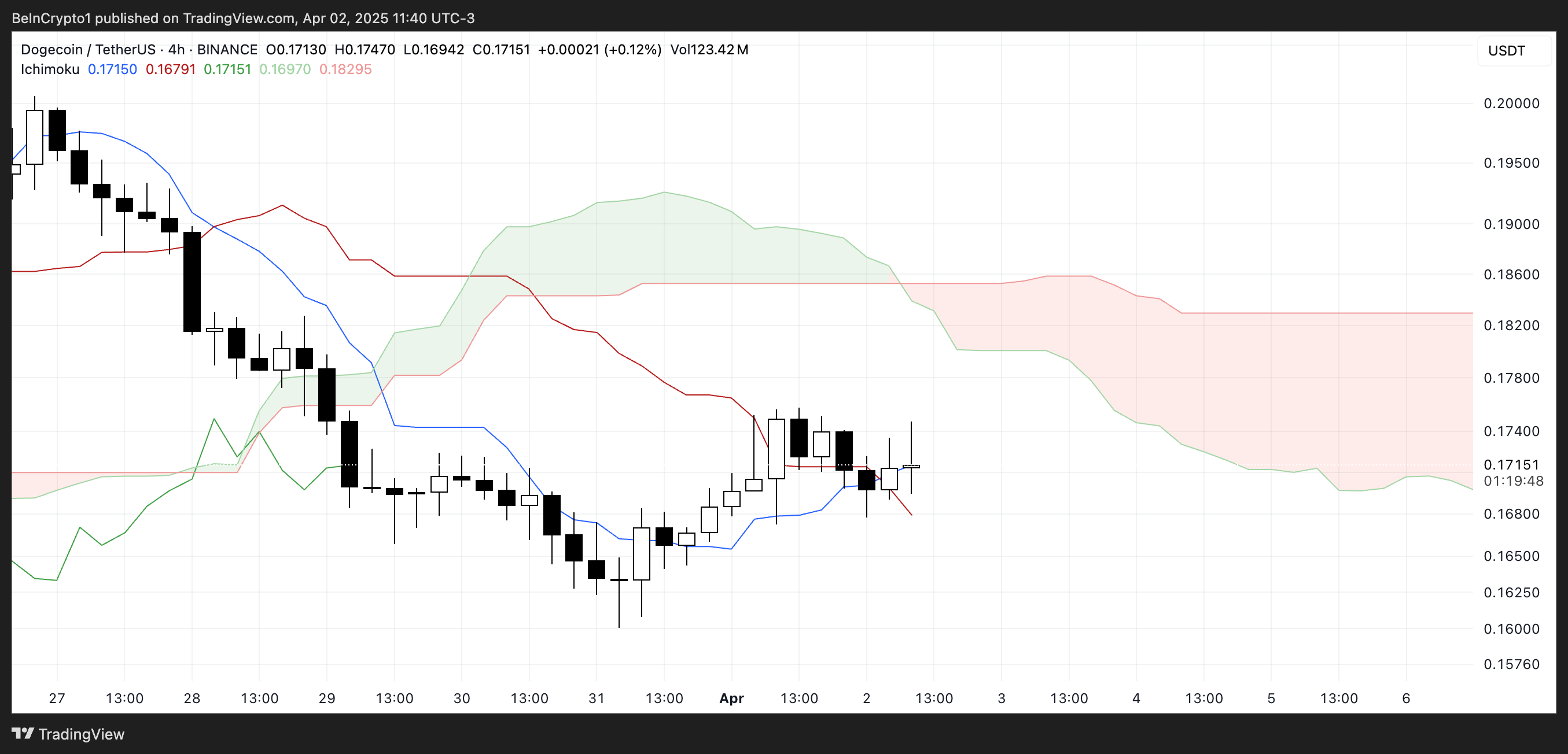 Dogecoin diagrammasi Ichimoku Cloud sozlamasini ko’rsatadi, bu so’nggi o’zgaruvchanlik va o’zgaruvchan momentumni aks ettiradi.