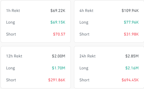 Ushbu umidsizlikka uchragan ko’rsatkich taxminan $ 2.8 million likvidatsiyaga olib keldi, savdogarlar Coinglass raqamlariga ko’ra, yuqoriga qarab narx harakatiga pul tikishdi $ 2 milliondan ko’proq yo’qotishdi.