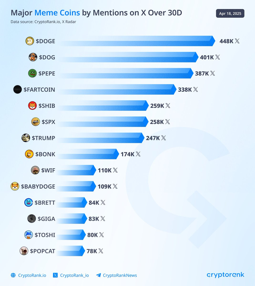 Ijtimoiy tarmoqlarda Dogecoin memecoin hikoyasini davom ettirmoqda. CryptoRank ma’lumotlariga ko’ra, o’tgan oyda X (sobiq Twitter) da eng ko’p esga olingan memecoin belgisi edi. Ushbu ko’rinish jamoatchilik ishtirokini va sarmoyadorlarning qiziqishini kuchaytirishda davom etmoqda.