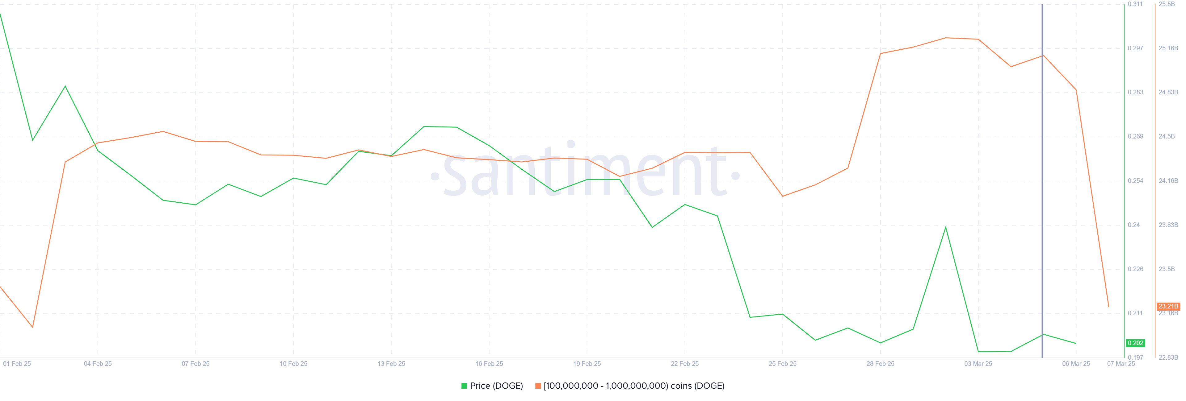 Katta miqdorda DOGE saqlaydigan kit investorlar ayanchli holatga tezda javob berishdi. So’nggi 48 soat ichida 100 milliondan 1 milliardgacha DOGE saqlaydigan manzillar 2 milliard DOGE sotdi, bu esa 400 million dollardan ortiq qiymatga ega.