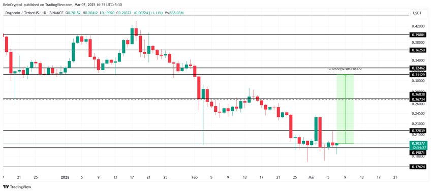 Agar Dogecoin ushbu qo’llab-quvvatlash darajasini ta’minlay olsa, altkoin $0.31 ga yetishi mumkin, bu esa taxminan 53% o’sishni anglatadi. Bu uning so’nggi yo’qotishlarining ko’p qismini tiklashiga va tendensiyani yana o’sishga aylantirishiga imkon beradi.