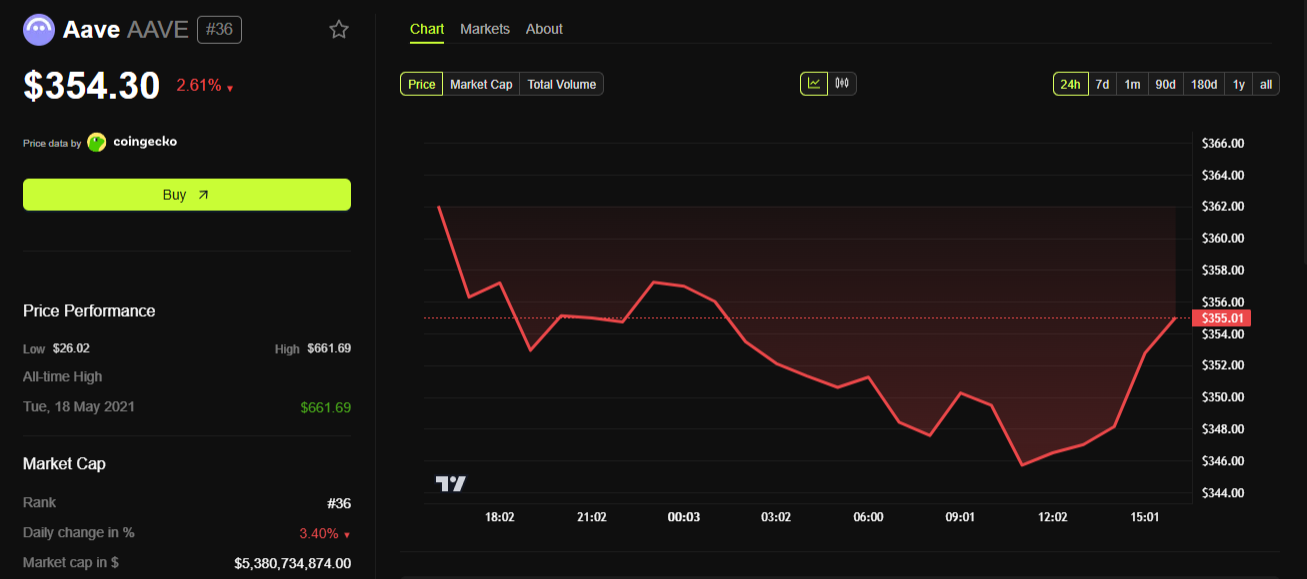 «BeInCrypto» ma’lumotlariga ko’ra, «AAVE» narxi almashinuvdan so’ng bir necha soat ichida qariyb 2% ga pasayib, $346.15 ga tushdi. Narx $343.63 va $367.73 oralig’ida o’zgarib turdi.