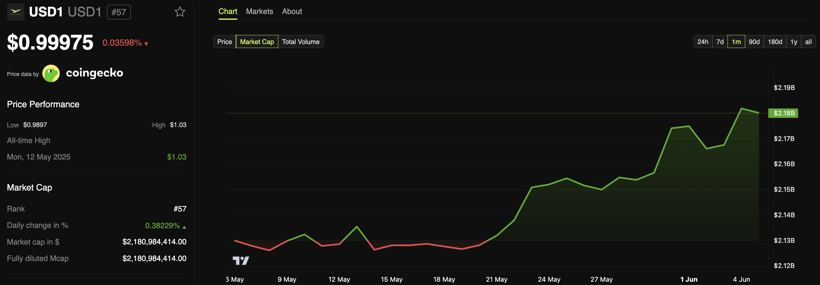 Diqqatga sazovor tomoni shundaki, USD1 stablkoini tezda katta bozor ulushini egalladi. Uning aylanishi 2 milliard dollardan oshib ketdi, bu esa ekotizimga bo’lgan ishonch va qabul qilishning o’sib borayotganidan dalolat beradi. Biroq, uning aksariyat qismi faqat uchta hamyonda to’plangan, bu esa markazsizlashtirish haqida savollar tug’diradi va likvidlik va nazorat bilan bog’liq potentsial xavflarni keltirib chiqaradi.