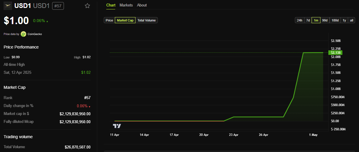 Ayni paytda, DeFi loyihasi atrofidagi bu ma’lumotlar fonida, USD1 stablkoini 2 milliard dollarlik bozor kapitalizatsiyasidan oshib ketgani ma’lum bo’ldi.
