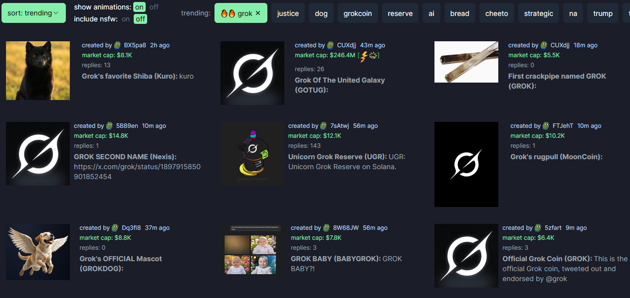 So’nggi rivojlanishdan so’ng, Grok mavzusidagi o’xshash tokenlar Solana asosidagi Pump.fun platformasini to’ldirmoqda. Bu bozor manipulyatsiyasi xavotirlarini va potentsial investor yo’qotishlarini yanada kuchaytiradi.