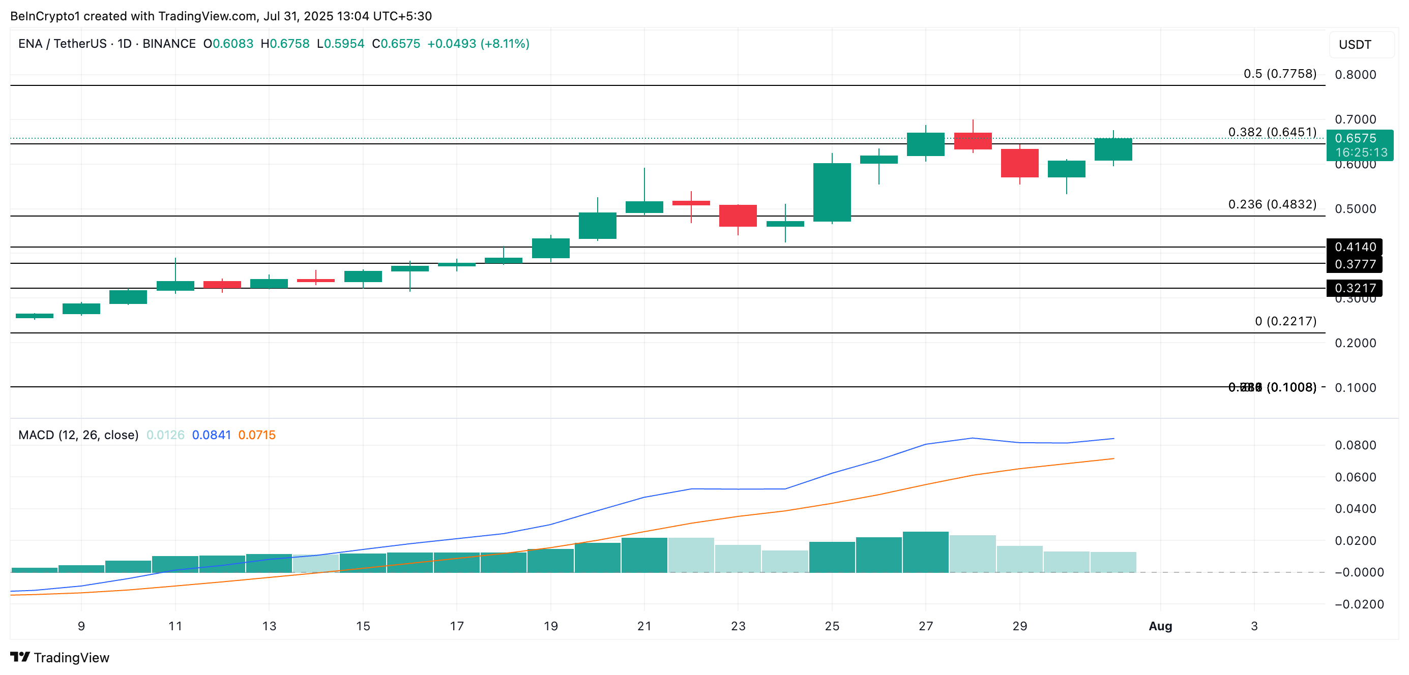 Texnik indikatorlar ham davom etayotgan ko’tarilish uchun dalillarni qo’llab-quvvatlaydi. ENAning Harakatlanuvchi O’rtacha Konvergentsiya Divergensiyasi (MACD) kundalik grafikda buqa kesishish naqshida qolmoqda. Bu aktivning MACD chizig’i (ko’k) signal chizig’idan (to’q sariq) yuqorida bo’lganda sodir bo’ladi, bu ko’pincha barqaror ko’tarilish harakati bilan bog’liq.