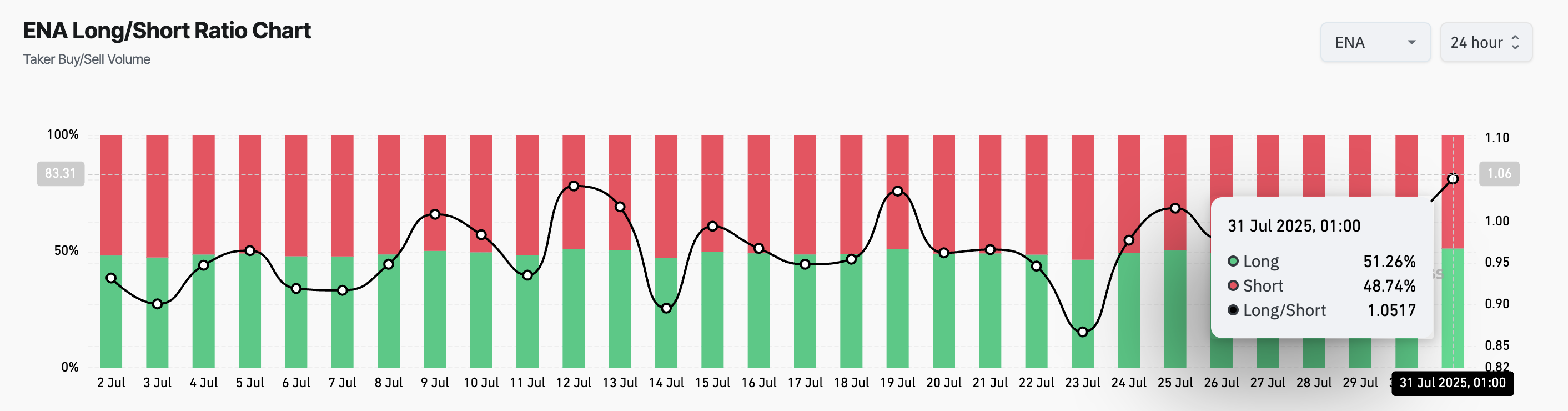 Bundan tashqari, fyuchers bozori ma’lumotlari investorlarning ishonchi oshayotganini ko’rsatadi. ENAning ochiq foizlari so’nggi 24 soat ichida 30% dan oshdi va hozirda $1.15 milliardni tashkil etmoqda.