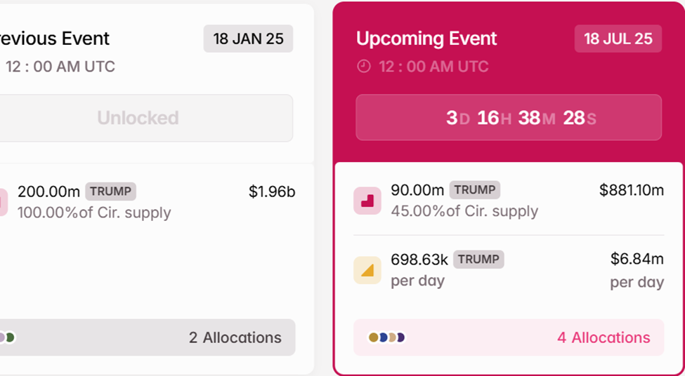 Bu haftada kuzatish kerak bo’lgan yana bir kripto yangilik – 18-iyul, juma kuni ochilishi kutilayotgan 881 million dollarlik TRUMP tokenlari. 90 million TRUMP tokenlari aylanmadagi ta’minotning 45% ni tashkil qiladi.
