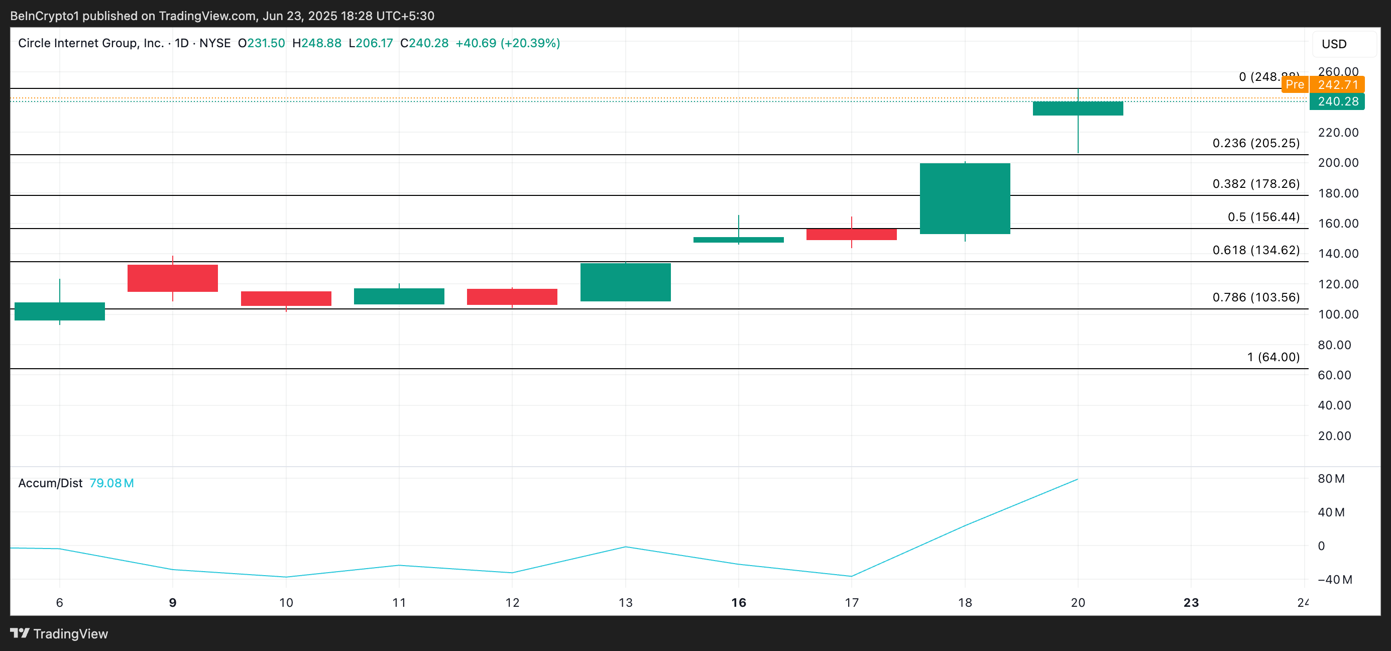 «Circle» kompaniyasining aksiyalari dushanba kuni bozor ochilishidan oldin 10.16% ga oshdi. Bu o‘tgan juma kuni aksiyaning 20.39% ga ko‘tarilishi bilan yakunlangan kuchli yopilishdan keyin sodir bo‘ldi. Barqaror token chiqaruvchi kompaniya AQSh dollariga bog’langan USDC tokeniga bo’lgan institutlar qiziqishi va kompaniyaning so’nggi IPOsi atrofidagi optimizm tufayli foyda ko’rishda davom etmoqda.