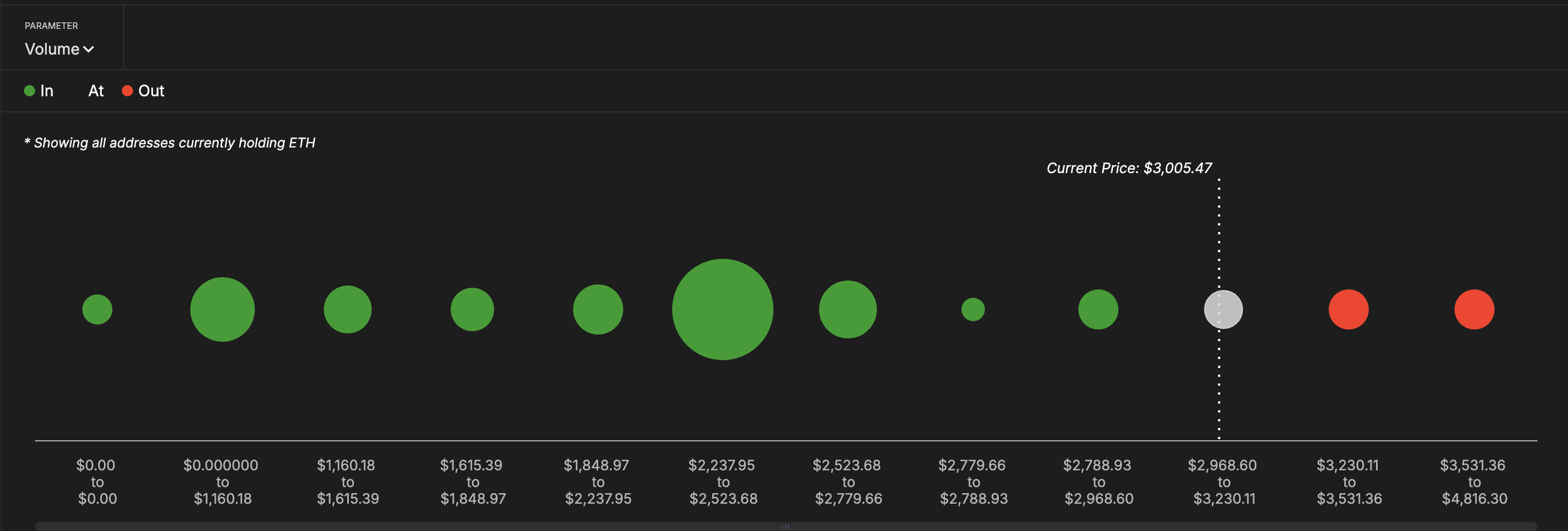 Hozirda eng katta blokcheyn hamyon klasteri $2,237 va $2,523 oralig’ida joylashgan, bu yerda millionlab manzillar foydada. Bu diapazon hozirgi harakatning asosi bo’lib xizmat qiladi, ishonch qayerdan kelib chiqqanini ko’rsatadi. Agar sur’at susaysa, bu daraja kuchli qo’llab-quvvatlash sifatida harakat qilishi mumkin, chunki foydada bo’lgan egalari sotishdan ko’ra ko’proq sotib olishga moyil.