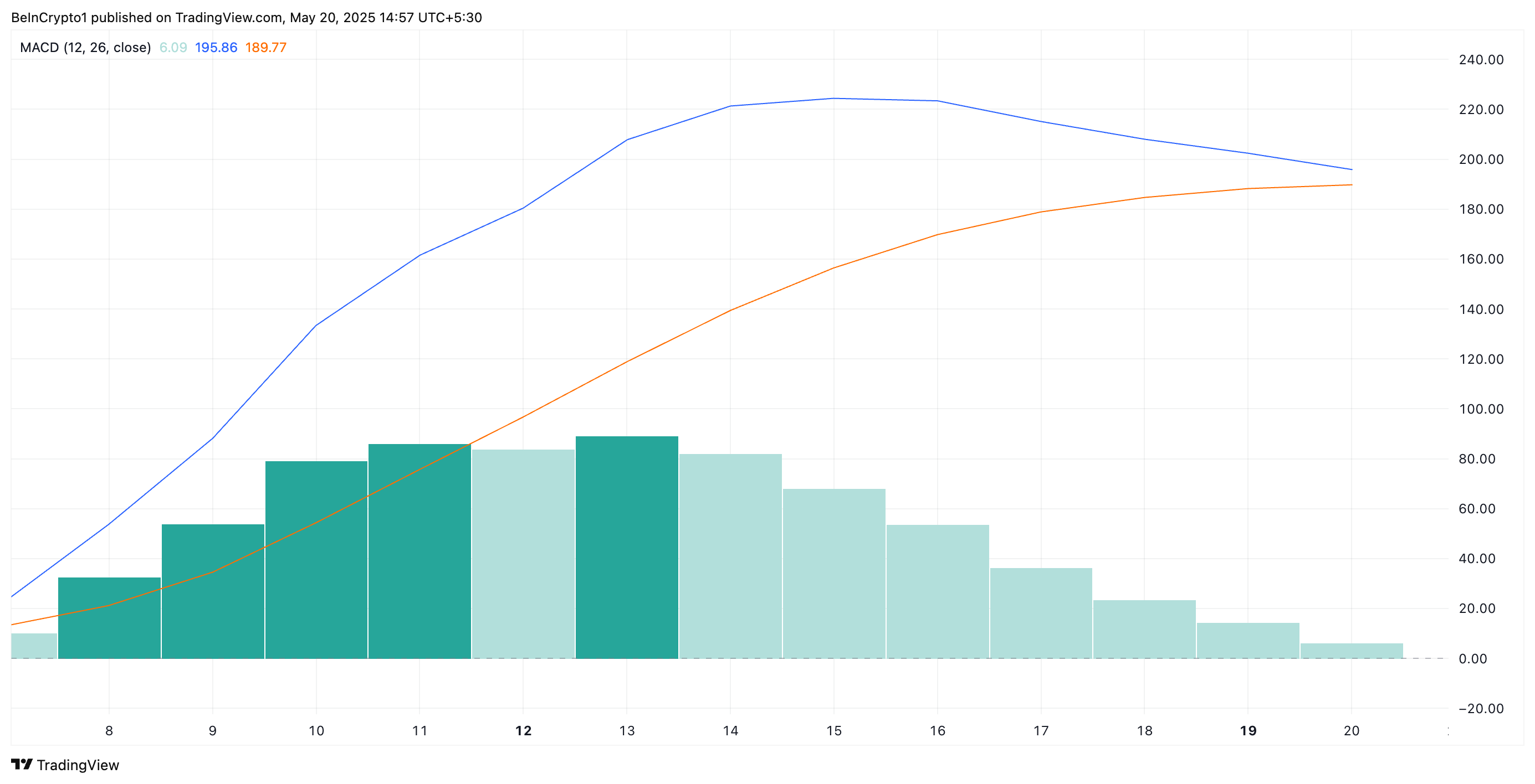 ETH/USD bir kunlik jadvalini tahlil qilish, Harakatlanuvchi O’rtacha Yaqinlashish Divergensiyasi (MACD) indikatorida o’lim kesishishi shakllanishi mumkinligini ko’rsatadi.