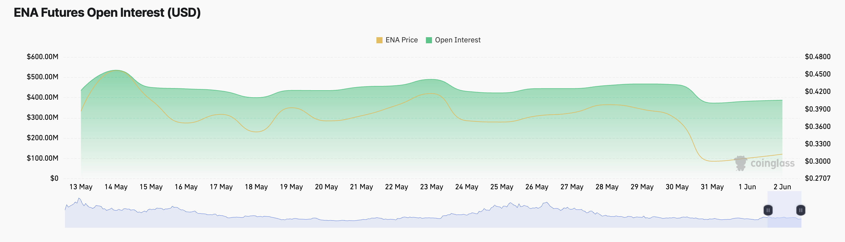 ENA holatida, ochiq foizlarning oshishi treyderlar ko’proq pozitsiyalar ochayotganini ko’rsatadi, ehtimol token ochilishiga qaramay, tiklanish yoki barqarorlikni kutishmoqda.
