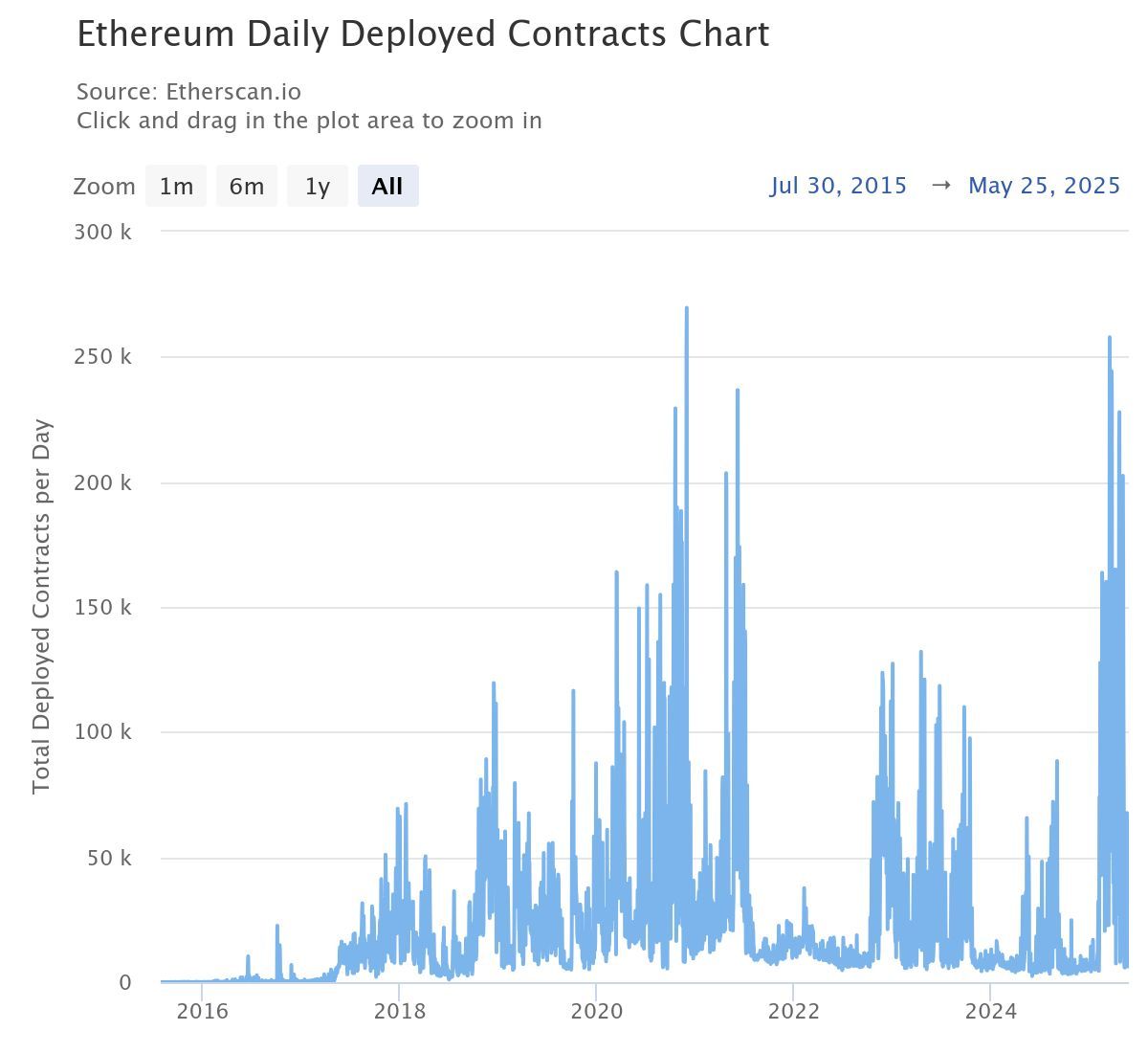 «Etherscan» ma’lumotlariga ko’ra, Efiriumda har kuni joylashtirilayotgan aqlli shartnomalar soni yil boshidan beri keskin oshdi. Grafikda 2025-yilning birinchi choragida har kuni joylashtirilayotgan shartnomalar soni 2021-yildan beri eng yuqori darajaga yetgani ko’rsatilgan. O’sha yili ETH narxi 4,800 dollardan oshgan edi.