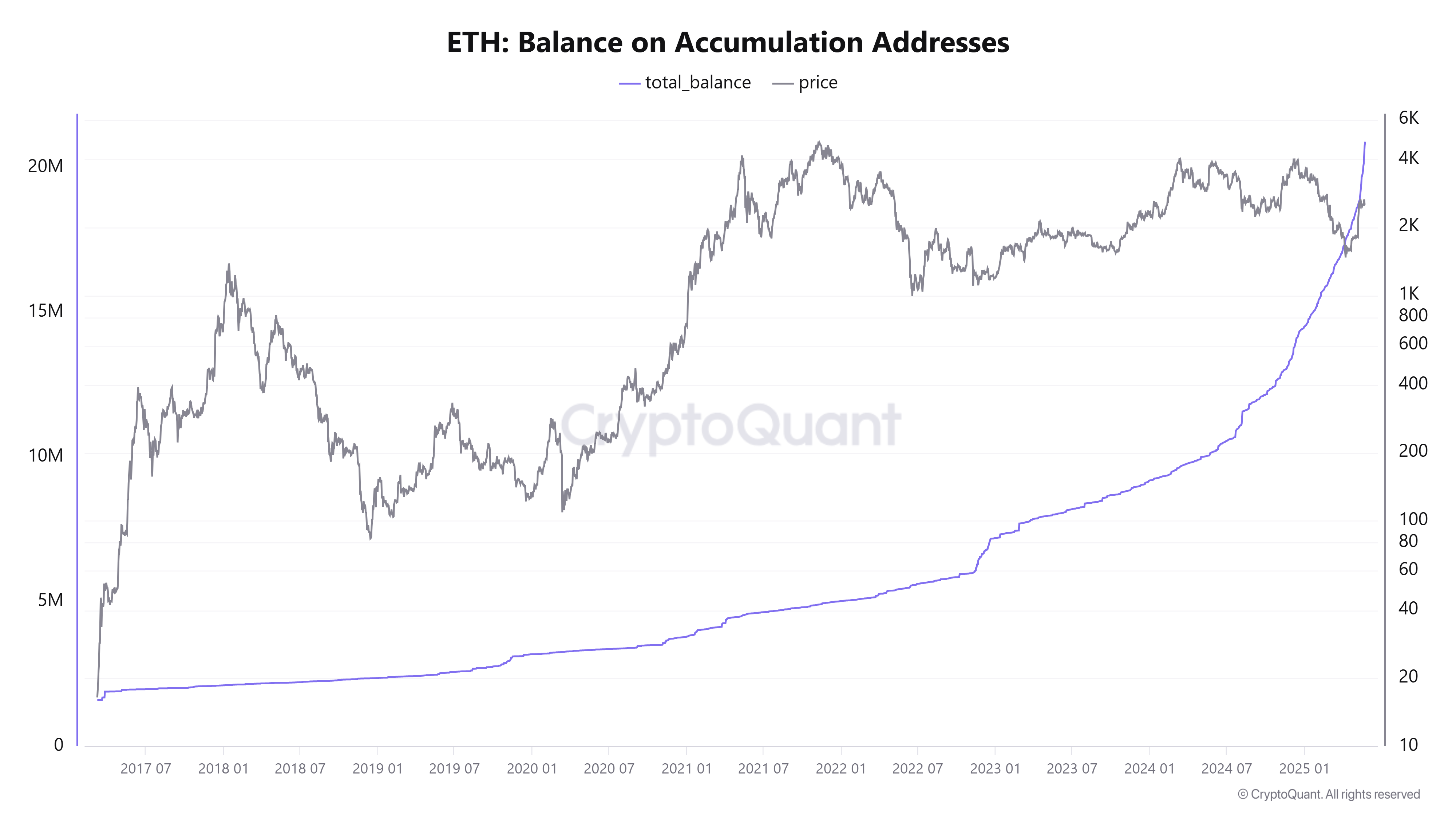 Natijada, to’planish hamyonlaridagi ETH balansi yangi yuqori darajaga yetdi — deyarli 21 million ETH, yoki aylanmadagi ta’minotning 17.5 foizi. 2025-yilda bu grafikdagi o’sish ETHga bo’lgan kuchli talabni ko’rsatadi.