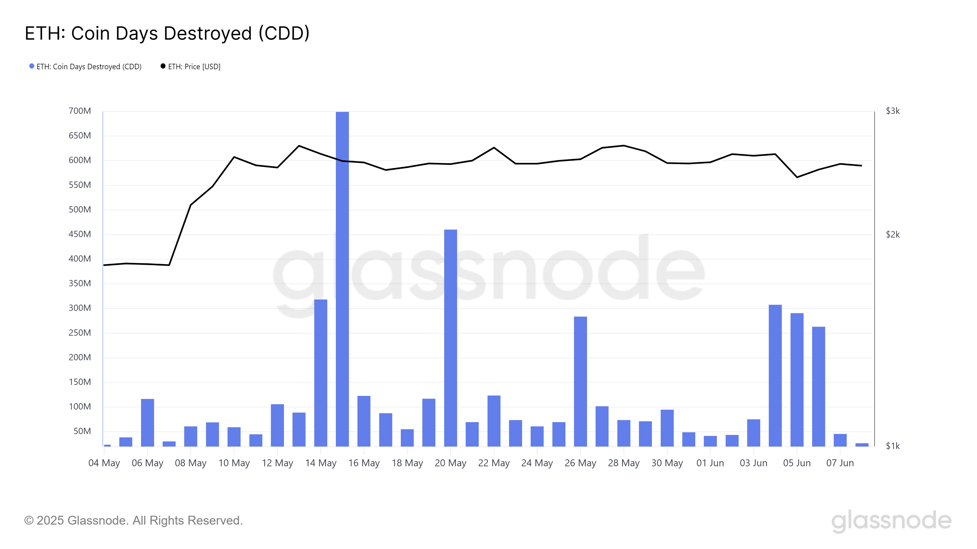 Efiriumning umumiy harakati uzoq muddatli egalarning (LTH) xatti-harakati bilan yanada ta’sirlanmoqda. Coin Days Destroyed (CDD) ko’rsatkichi shuni ko’rsatadiki, LTHlar so’nggi kunlarda sotish faoliyatini oshirmoqda. CDDning ketma-ket o’sishi, odatda aktivning tayanchi bo’lgan LTHlar, o’zlarining optimizmi pasaygani sababli o’z ulushlarini ko’chirishayotganini ko’rsatadi.