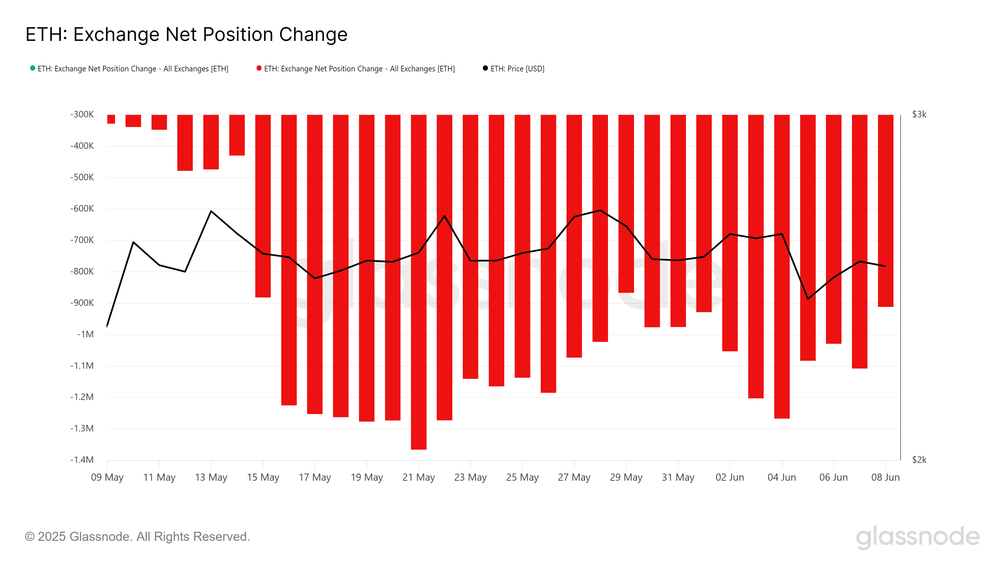 Efiriumning birja net pozitsiyasi o’zgarishi shuni ko’rsatadiki, ETH yana birjalarga qaytmoqda, bu esa ayirbosh bozor belgisidir. So’nggi besh kun ichida investorlar tomonidan taxminan 350,000 ETH, ya’ni $870 milliondan ortiq qiymatdagi kriptovalyuta sotilgan. Bu sotish bosimining ortishi ETH egalari orasidagi ishonchning pasayishini ko’rsatadi.
