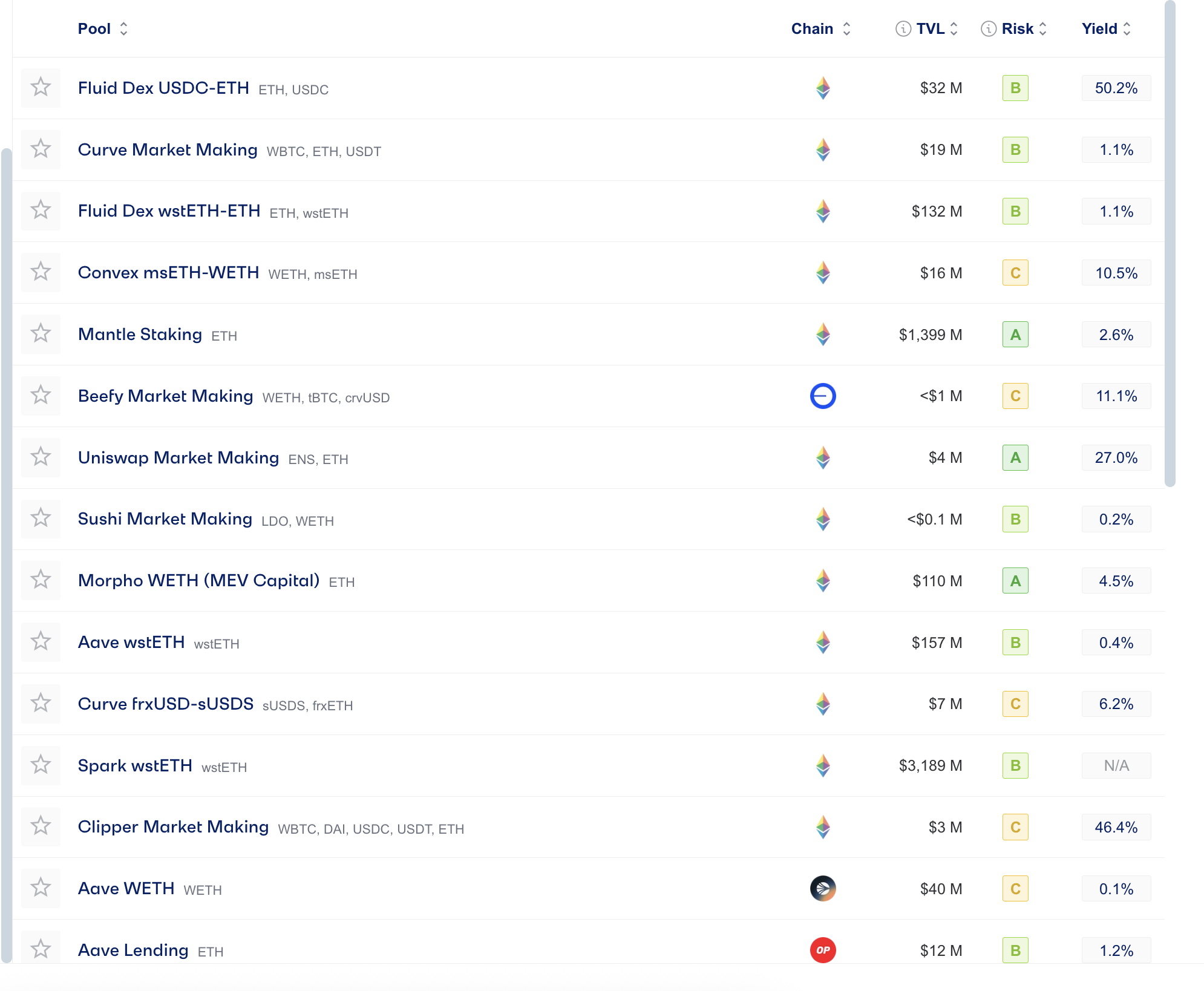 Boshqa havzalar, jumladan «Fluid Dex USDC-ETH» va «Uniswap ENS-ETH», 27–50% yuqori daromad ko’rsatmoqda, lekin katta xavf bilan. Efirium narxi o’sishi yangi likvidlikni jalb qilganida, daromad izlovchilar xavfsizroq «Aave» uslubidagi kreditlarni xavfliroq, yuqori daromadli havzalar bilan muvozanatlashmoqda.