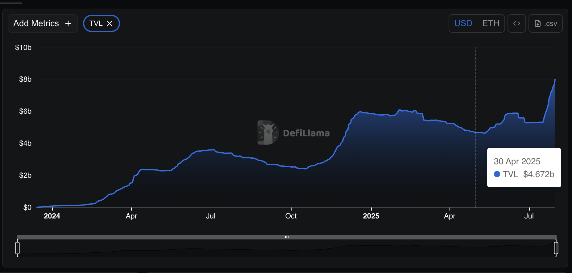 USDe ning umumiy ta’minoti 30-apreldan beri deyarli 80% ga o’sdi, taxminan 4,66 milliarddan 8,03 milliarddan oshdi. Shu bilan birga, staking qilingan USDe foizi taxminan 45% dan 56,3% ga oshdi, bu esa ushbu barqaror derivativlardan qo’shimcha daromad olishga bo’lgan ishonchning oshayotganini ko’rsatadi. «Ethena»ning o’z TVL (umumiy qiymati) 8,1 milliard dollarga ko’tarildi, bu esa kuchli kapital oqimini aks ettiradi.
