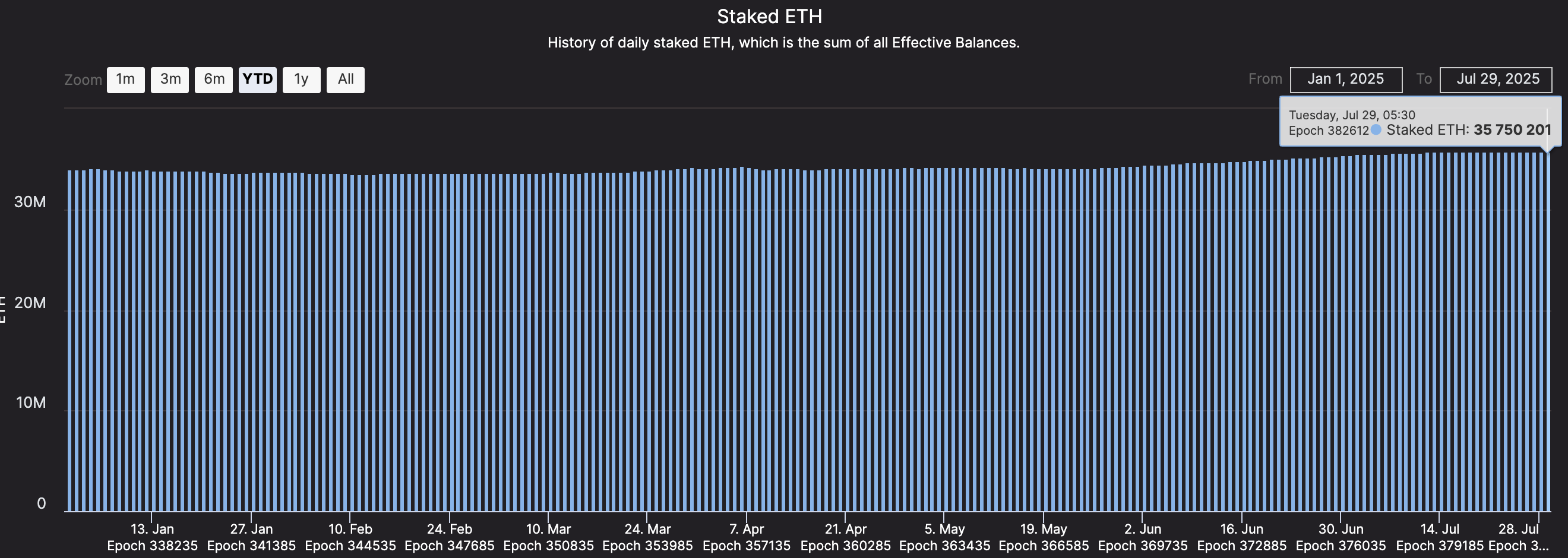 «Efirium»ning so’nggi o’sishi investorlarni narx o’sishidan tashqari qo’shimcha daromad izlashga undab, ko’proq tokenlarni staking shartnomalariga jalb qilmoqda. «Beacon Chain» ma’lumotlariga ko’ra, 29-iyul holatiga 35,750,201 «Efirium» (ETH) staking qilingan, bu yil boshidan beri barqaror o’sib bormoqda.